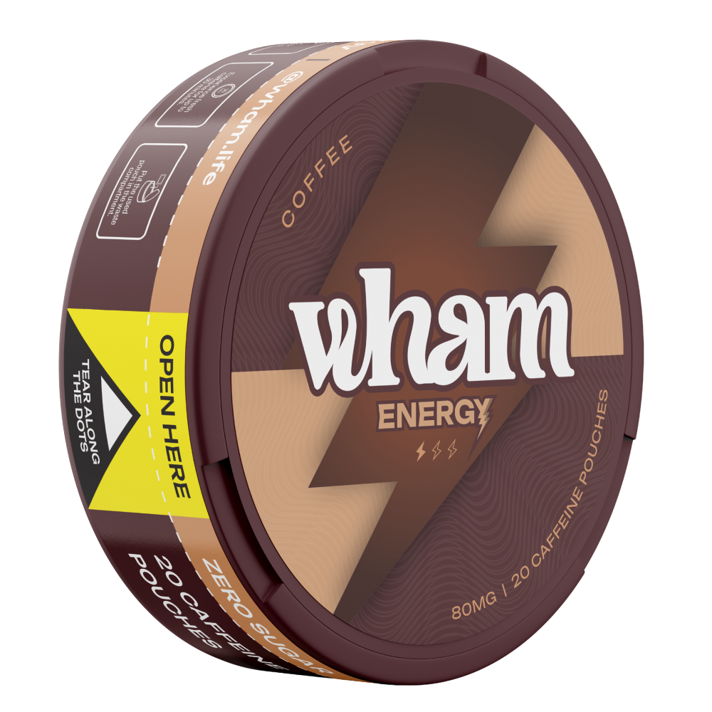 Wham Energy is a pocket-sized caffeine pouch you place under your lip. It gives you a fast and clean energy boost.